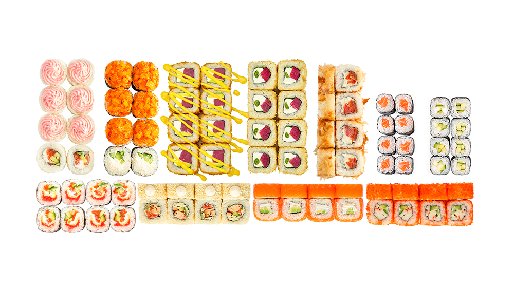 Filadelfija Original – 8 kom, Tuna Sun – 8 kom, Gejša – 8 kom, Kalifornija Krab – 8 kom, Cezar – 8 kom, Lava – 8 kom, Double Tuna– 8 kom, Bonito – 8 kom, Krab hot – 8 kom, Rolnice Losos – 8 kom, Rolnice Avokado – 8 kom