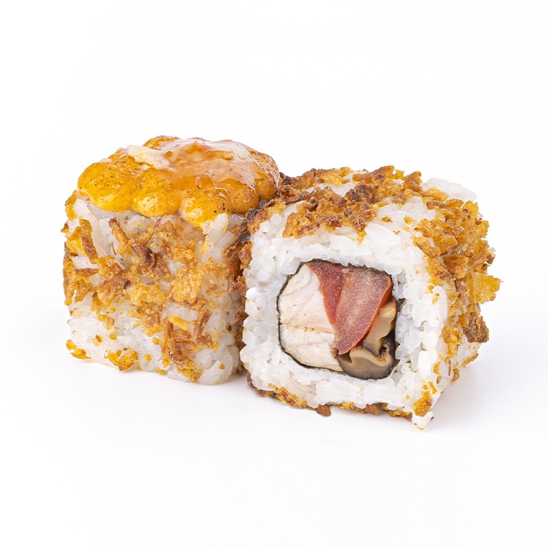 Dimljena piletina, paradajz, šitake pečurke, prženi luk, slatki čili sos, spajsi sos, parmezan sir