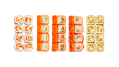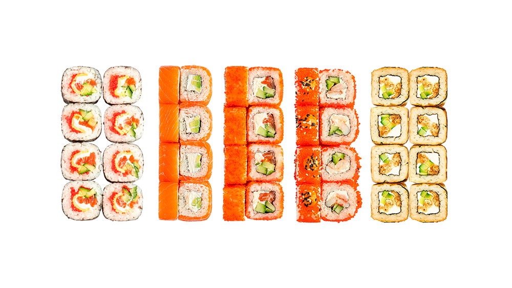 Filadelfija Original – 8 kom, Kalifornija Losos – 8 kom, Sanrajz – 8 kom, Gejša – 8 kom, Smoky salmon– 8 kom
