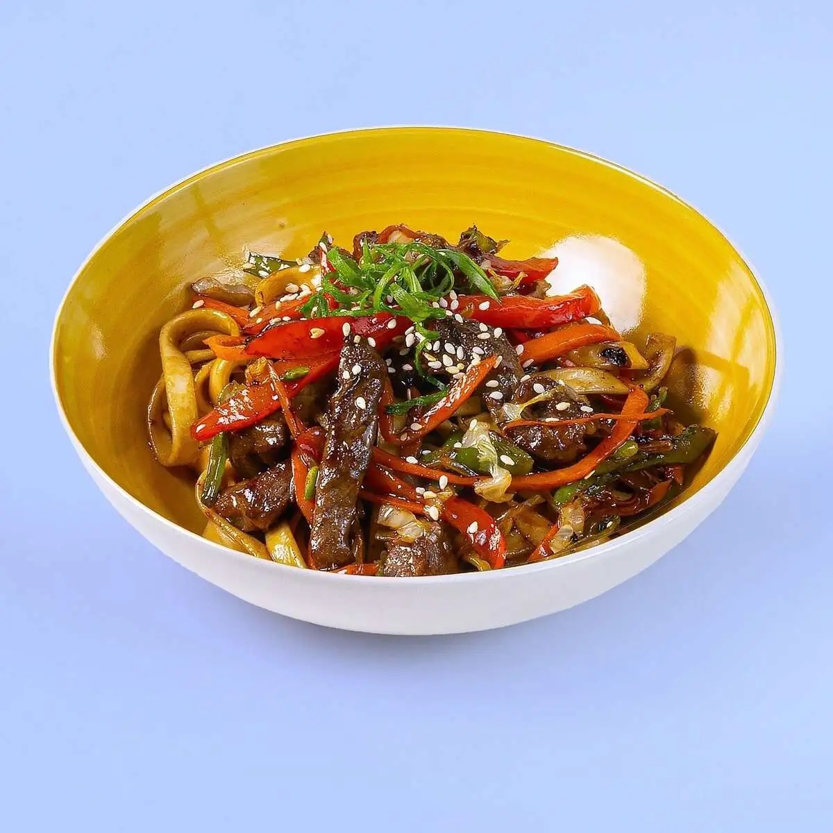 Pšenični udon rezanci, junetina, terijaki sos, susam, slatka paprika, šargarepa, kupus, crni luk, boranija