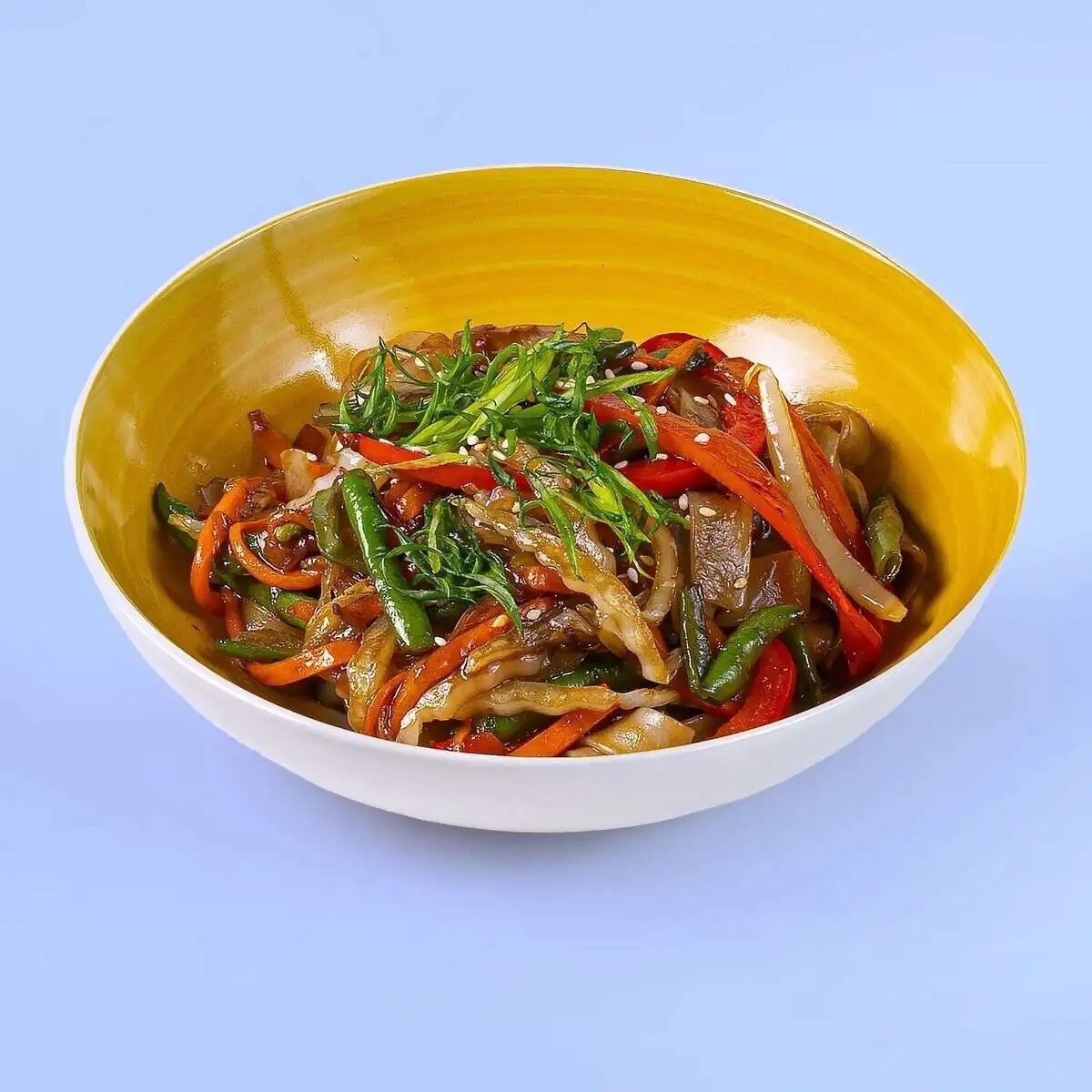 Pirinčani rezanci, terijaki sos, susam, slatka paprika, šargarepa, kupus, crni luk, boranija